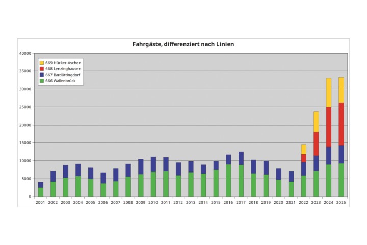 Seit der Erweiterung des Bürgerbusverkehrs in die Ortsteile Lenzinghausen und Hücker-Aschen hat sich die Zahl der Fahrgäste von 14.455 im Jahr 2022 auf 33.352 im Jahr 2025 um mehr als 130 % erhöht. Hinzu kommen noch über 300 Fahrgäste anlässlich der Sonderverkehre zum Warmenau-Open-Air Festival und zum Weinmarkt. Täglich nutzen inzwischen über 120 Fahrgäste die beiden Busse. Diese positive Entwicklung liegt aber nicht nur an den zusätzlichen Linien, die seit Mai 2022 bedient werden. Auch die Fahrgastzahlen der seit dem Jahr 2000 bedienten Linien nach Wallenbrück und Bardüttingdorf sind im gleichen Zeitraum von 9.581 auf 14.159, um fast 50 % angestiegen.