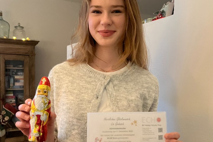 Die glückliche Gewinnerin der ersten Auslosung vom 6.12. heißt Liv Gedusch. An allen sechs Tagen lag sie mit ihrer Antwort richtig und landete deshalb 6 mal im Lostopf. Damit erhöhte sie ihre Chancen und gewann schließlich!