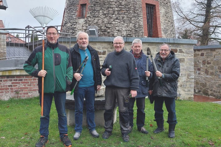 Das Areal rund um die Windmühle Hücker-Aschen ist jetzt fit für den Frühling. Mitglieder des Heimatvereins Hücker-Aschen haben die Grünflächen vom welken Herbstlaub befreit, die Heckenrosen beschnitten und den Efeu-Bewuchs am Mühlenstumpf getrimmt.
