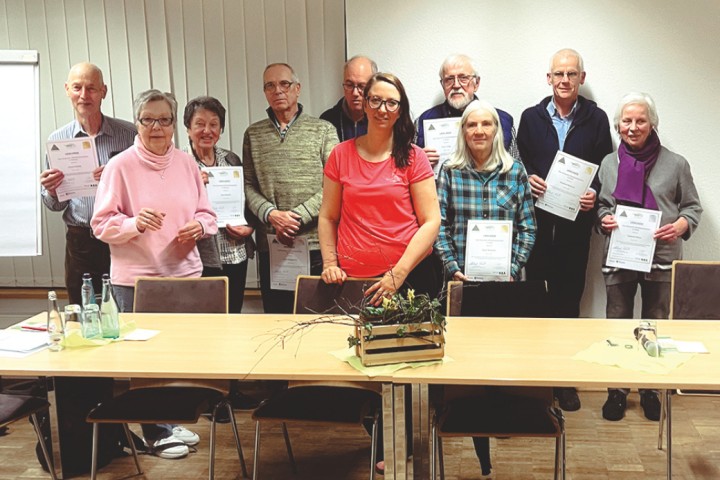 | Heiner Schaefer, Elke Ennen, Anne Sogorski, Jobst Brüggemeier, Thoms Gößling, Franz Thöle, Beate Wehmeier, Eckhard Wehmeier und Sieglinde Mahne. Nicht auf dem Bild: Manfred Mahne, Eva Neumann, Regine und Klaus Peter Hoffmann. Mit den ausgezeichneten Wanderern freut sich Ricarda Kurschel, Vorsitzende des Heimatvereins Spenge (Bildmitte). |